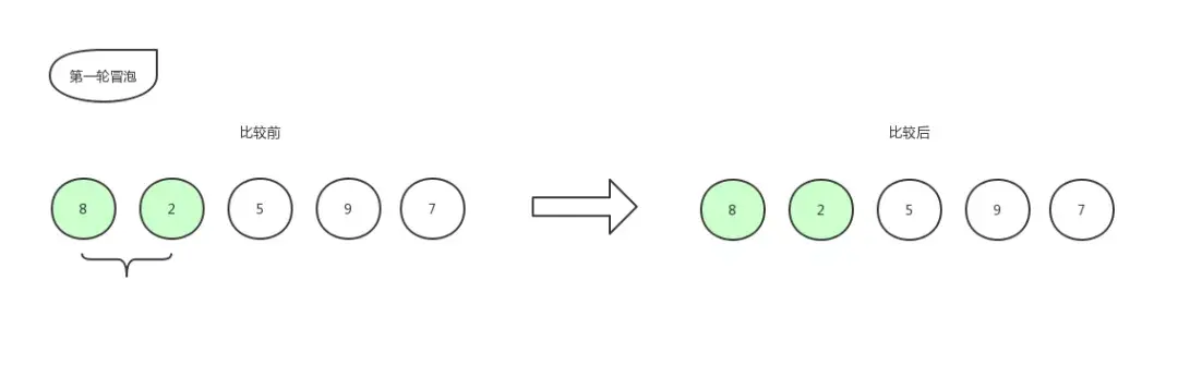 首先比较第一个数和第二个数的大小,我们发现 2 比 8 要小,那么保持原位,不做改动。位置还是 8,2,5,9,7 。