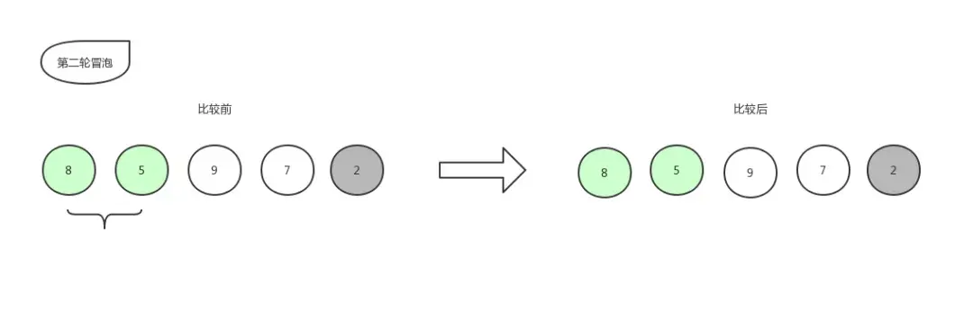 比较第二个数和第三个数的大小,发现 2 比 5 要小,所以位置交换,交换后数组更新为:[ 8,5,2,9,7 ]。