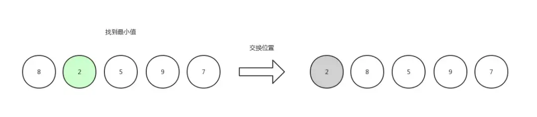 第一次选择,先找到数组中最小的数字 2 ,然后和第一个数字交换位置。(如果第一个数字就是最小值,那么自己和自己交换位置,也可以不做处理,就是一个 if 的事情)