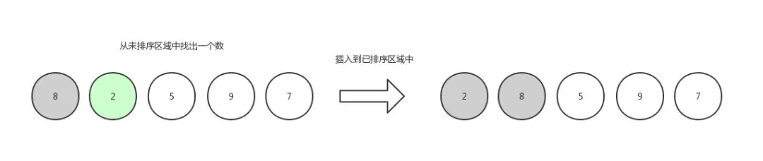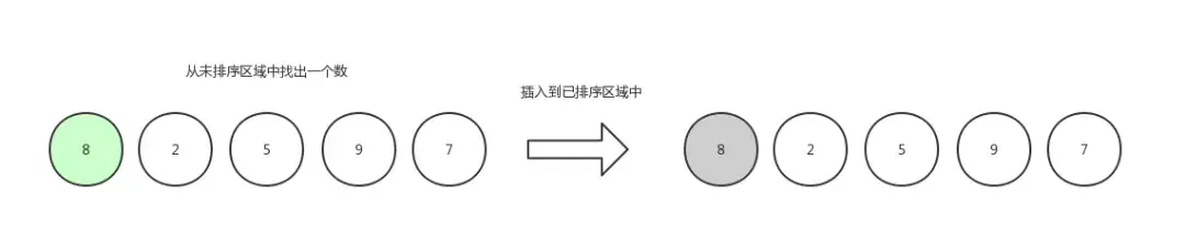 例子:数组初始化:[ 8,2,5,9,7 ],我们把数组中的数据分成两个区域,已排序区域和未排序区域,初始化的时候所有的数据都处在未排序区域中,已排序区域是空。
