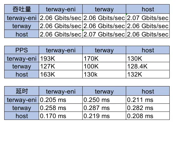 - 从容器流出的流量角度看,terway-eni模式整体明显高于terway默认网络模式,但低于宿主机网络性能