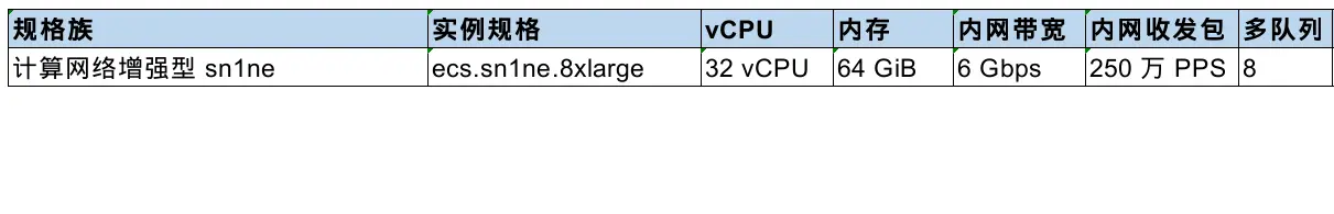 测试机型选用ecs.sn1ne.8xlarge,规格详情如下