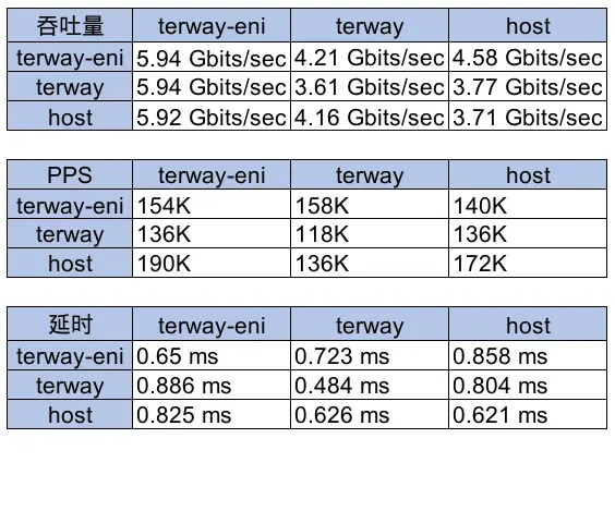 - 从流入容器的流量角度看,terway-eni的PPS结果数据优势比较明显,接近甚至超越宿主机网卡性能