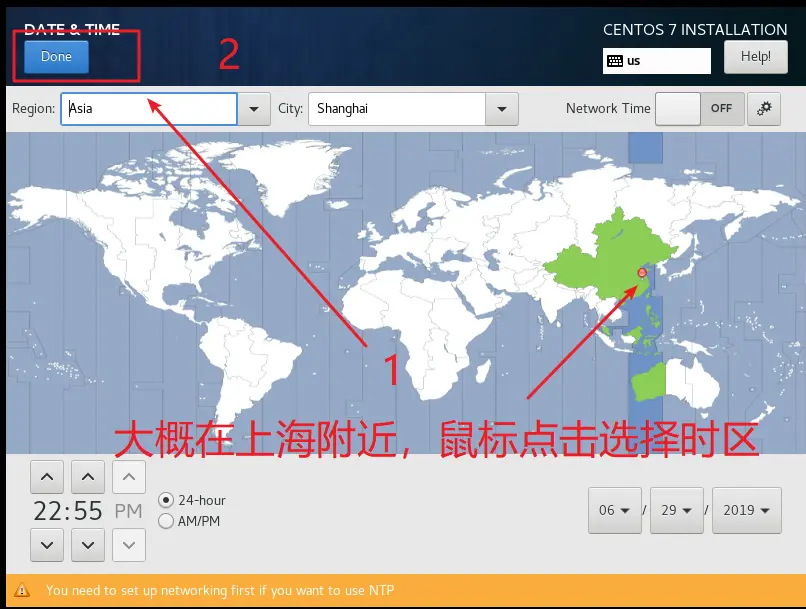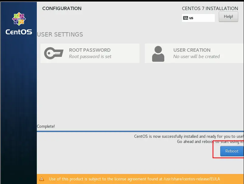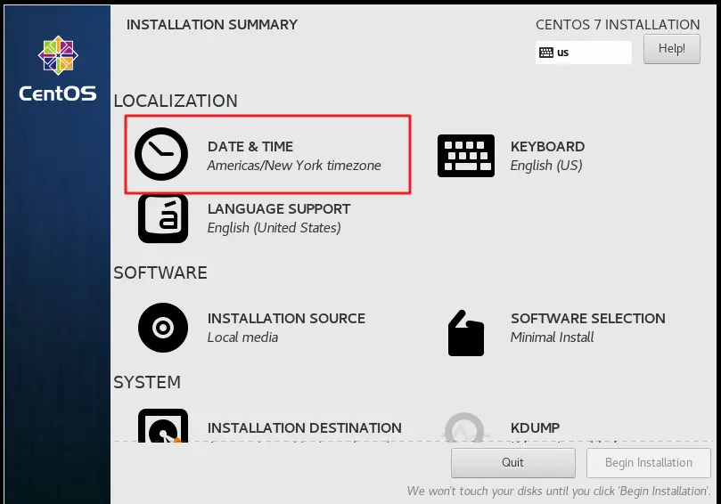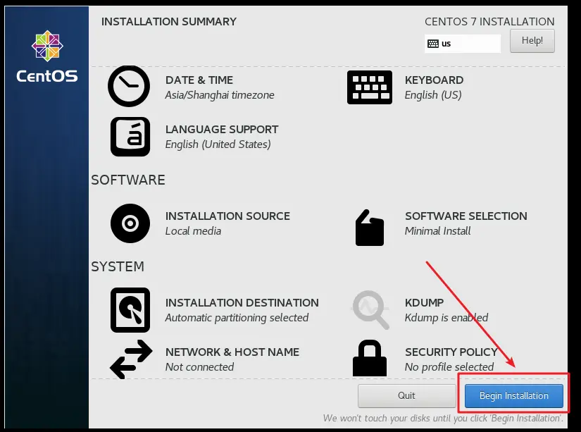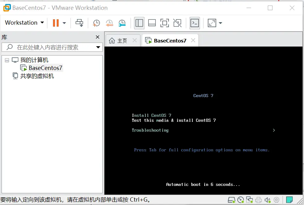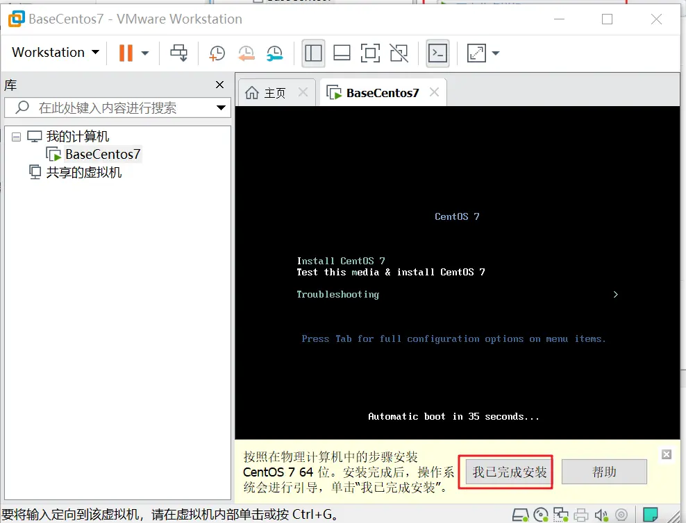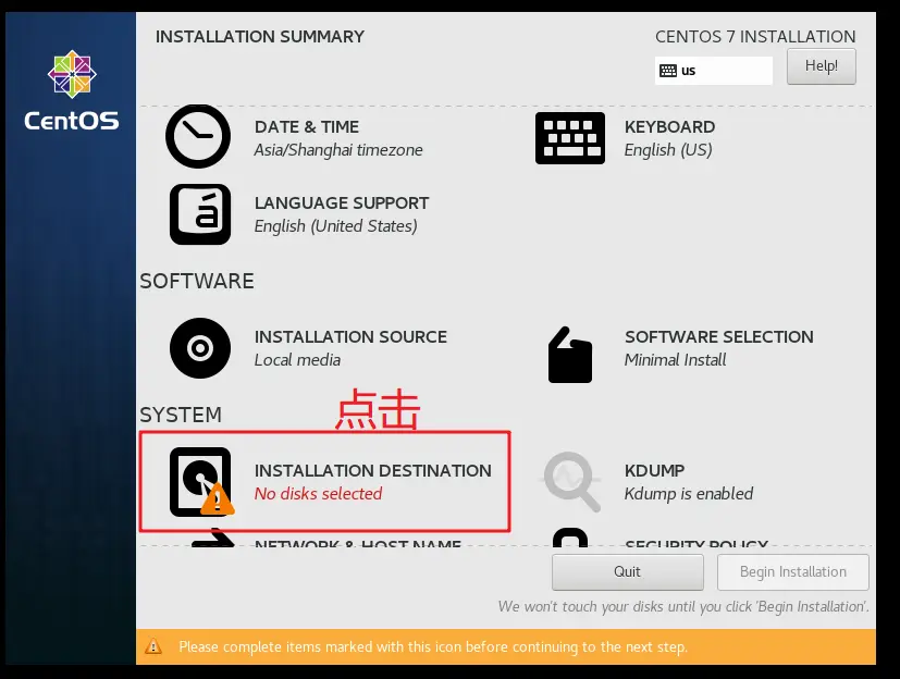 4、运行虚拟机 点击开始此虚拟机--->点击我已完成安装--->弹出CD-ROM门锁定,点击是--->安装tools--->选择english--->点击DATE&TIME选择shanghai点击Done--->点击INSTALLATION SOURCE,选择磁盘点击Done--->点击Begin installation--->点击设置管理员root用户的密码为root,等待安装--->点击Reboot重新启动--->重启后,显示localhost login :(冒号)后有个不停闪烁的白色短横杠,其中localhost表示当前主机名称,至此虚拟机安装完成---> 输入用户名root,输入密码:root,回车--->显示[root@localhost ~]#--->登录成功