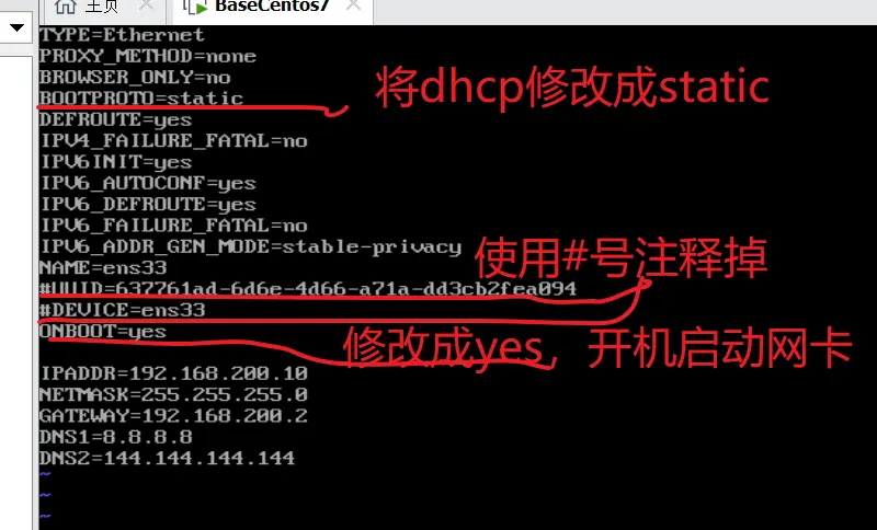 修改BOOTPROTO=dhcp 后dicp改为static UUID和DEVICE是呀#注释 ONBOOT=no改成yes