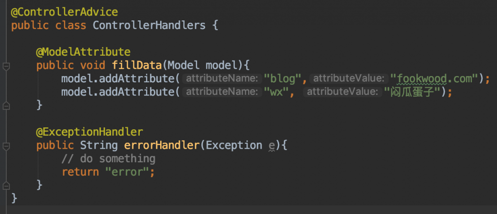Controller Advice字面上意思是“控制器通知”,Advice除了“劝告”、“意见”之外,还有“通知”的意思。你可以将@ModelAttribute和@ExceptionHandler标记的方法提取出来,放到一个类里,并将加上@ControllerAdvice,这样,所有的控制器都可以用了:
