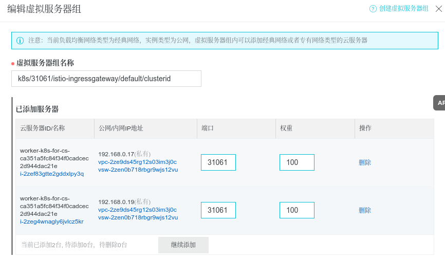 创建成功后,会在阿里云控制台上发现,LoadBalancer类型的Service会自动为我们创建好一个阿里云负载均衡(182.92.251.227)实例并将我们的两个node节点的31061端口作为阿里云负载均衡实例的后端服务,如下图所示: