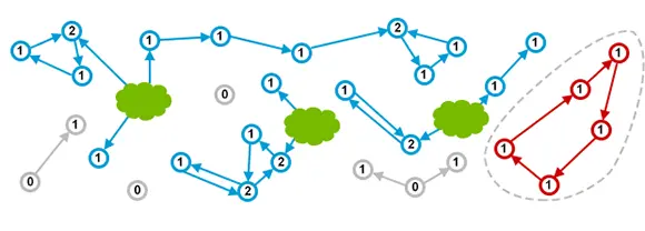 最后,灰色圆圈是未从任何仍显式使用的对象引用的对象(这些对象由绿色云直接引用)。