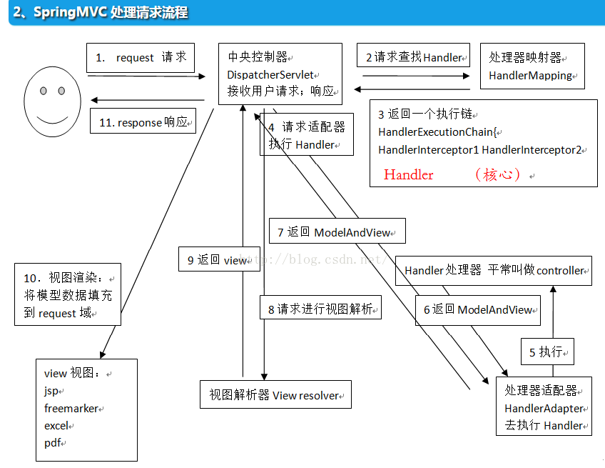 注意:View是一个接口,实现类支持不同的View类型(jsp、freemarker、pdf…); ps:不需要程序员开发的,需要程序员自己做一下配置即可。