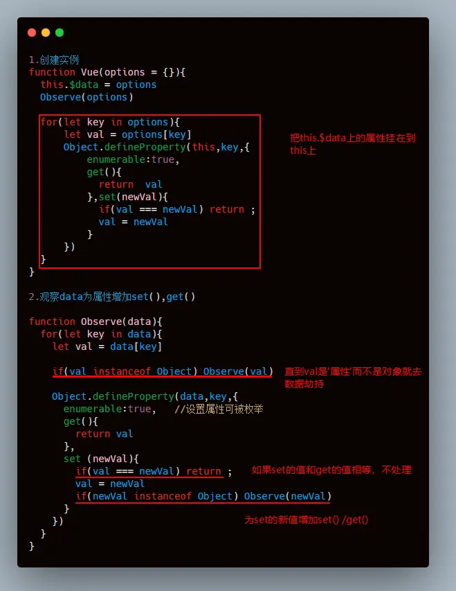当你把一个普通的 JavaScript 对象传入 Vue 实例作为 data 选项,Vue 将遍历此对象所有的属性,并使用 Object.defineProperty 把这些属性全部转为 getter/setter。