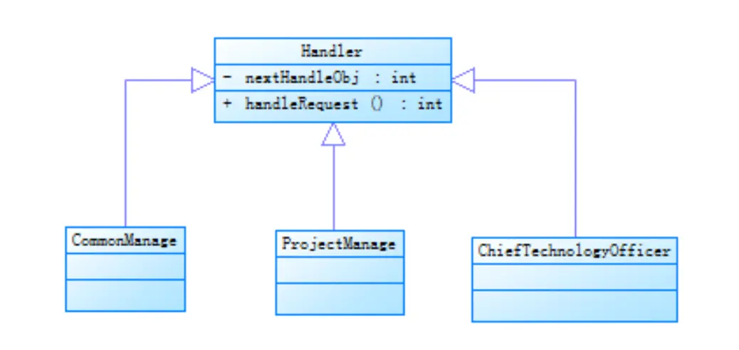 下图中,我们定义了抽象类Handler表示处理请求的角色。具体实现有CommonManage 普通管理员,只能处理非核心代码权限开发。ProjectManage 项目经理,能开放核心代码权限。ChiefTechnologyOfficer、能开发所有代码权限,包括支付等核心中的核心。
