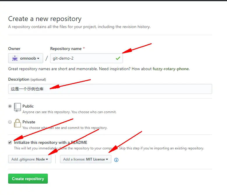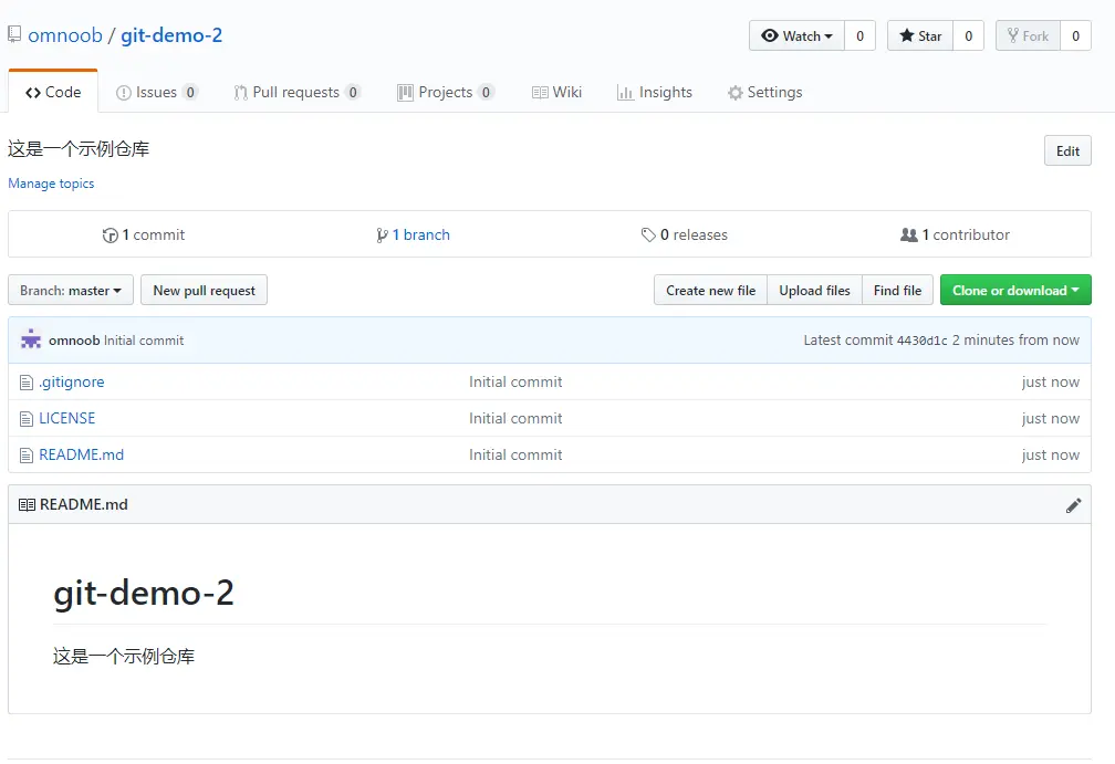 1.在GitHub上建立一个新的仓库 git-demo-2 ,这一次建一个自带 README 和 Lisence 的仓库