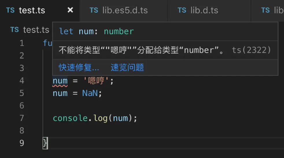 我们为num添加了一个number类型约束,然后为num赋值个字符串,如下图,提示错误,但是赋值NaN,就没有报错,这就符合我们对NaN的认知,在Js的知识中,它就是代表一个数字 。