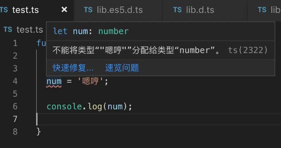 这里我们没有给num设置类型约束啊,但是ts会因为Math.abs的返回值类型,推断出num是个数字类型。相当于为其加了类型约束了。