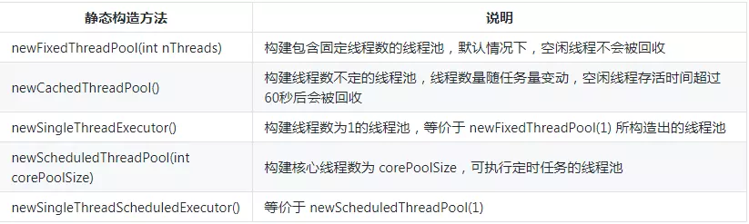 一般情况下,我们并不直接使用 ThreadPoolExecutor 类创建线程池,而是通过 Executors 工具类去构建线程池。通过 Executors 工具类,我们可以构造5中不同的线程池。下面通过一个表格简单介绍一下几种线程池,如下: