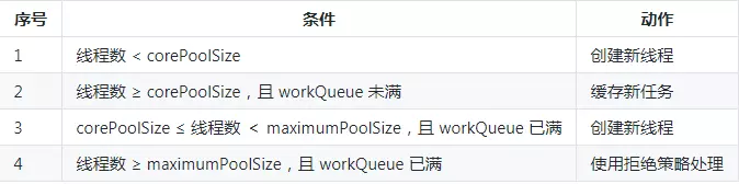 在 Java 线程池实现中,线程池所能创建的线程数量受限于 corePoolSize 和 maximumPoolSize 两个参数值。线程的创建时机则和 corePoolSize 以及 workQueue 两个参数有关。下面列举一下线程创建的4个规则(线程池中无空闲线程),如下: