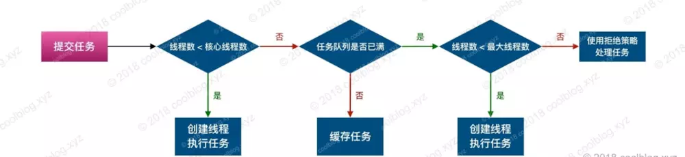 通常情况下,我们可以通过线程池的submit方法提交任务。被提交的任务可能会立即执行,也可能会被缓存或者被拒绝。任务的处理流程如下图所示: