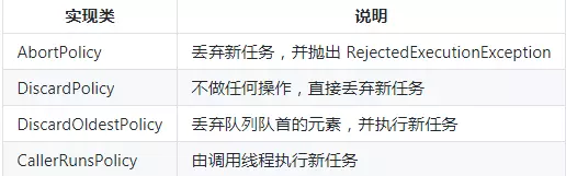 如3.1.2 线程创建规则一节中规则4所说,线程数量大于等于 maximumPoolSize,且 workQueue 已满,则使用拒绝策略处理新任务。Java 线程池提供了4中拒绝策略实现类,如下: