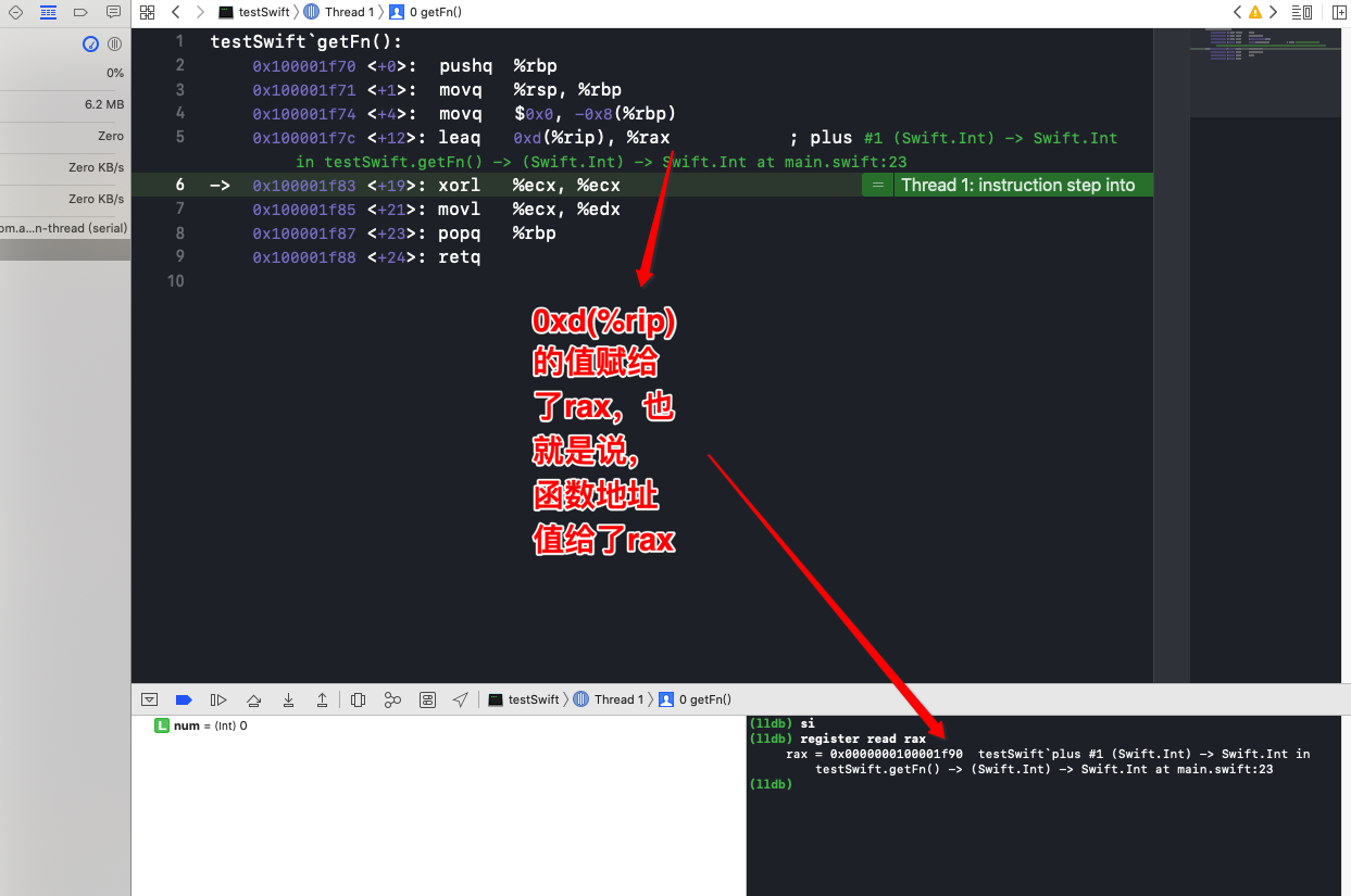 -> 0x100001f7c <+12>: leaq 0xd(%rip), %rax ; plus #1 (Swift.Int) -> Swift.Int in testSwift.getFn() -> (Swift.Int) -> Swift.Int at main.swift:23