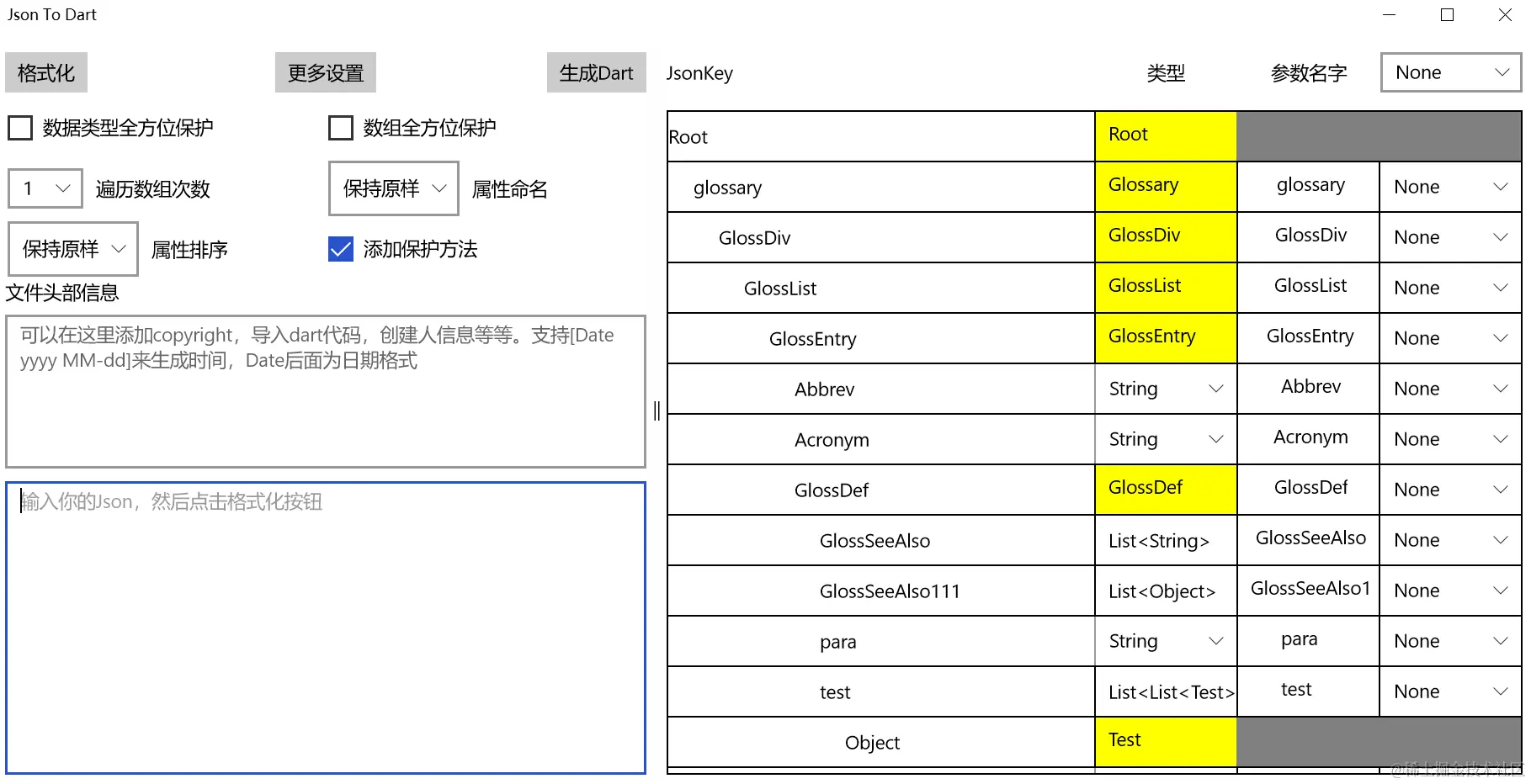 左边是json的输入框以及最后Dart生成的代码,右边是生成的Json类的结构
