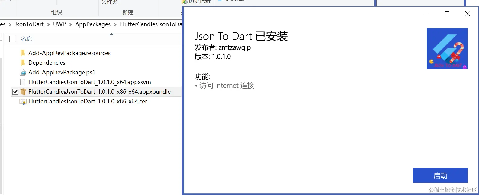 后面如果工具有更新,可以下载最新的,然后点击FlutterCandiesJsonToDart_x.0.x.0_x86_x64.appxbundle 安装