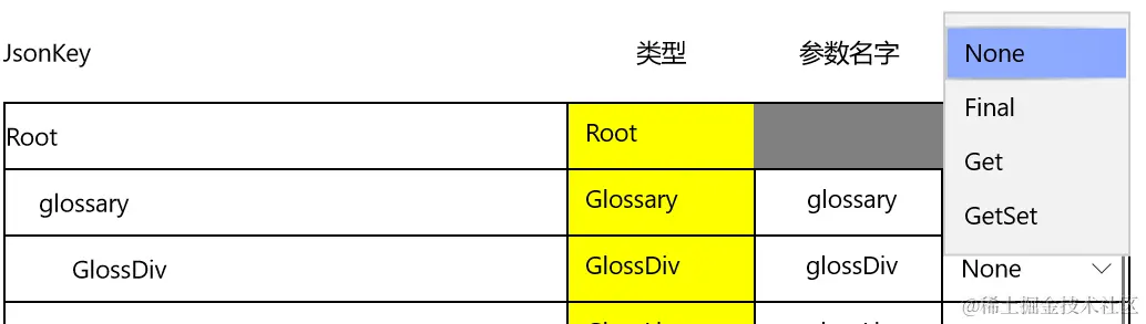 点击格式化之后,右边会显示可视化的json类结构,在右边一列,就是属性访问器类型设置