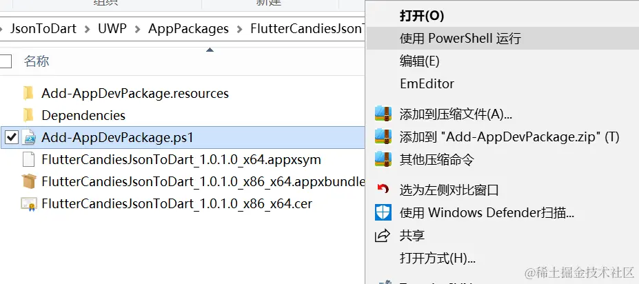 第一次安装,需要安装证书,请按照下图,使用PowerShell打开Add-AppDevPackage.ps1,一路接受就安装完毕
