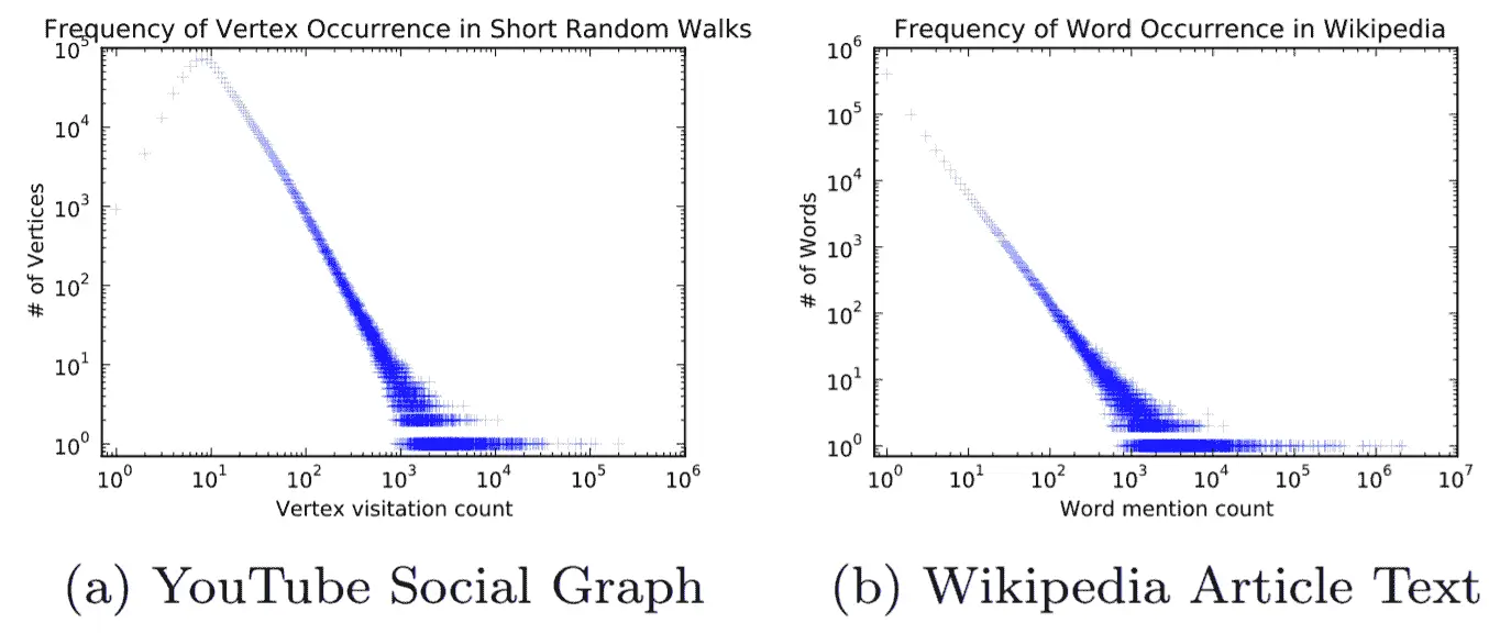 选择在线随机游走作为捕获图形结构的基元,我们现在需要一种合适的方法来捕获这些信息。 如果连通图的度分布遵循幂律(无标度),我们观察到顶点出现在短随机游走中的频率也将遵循幂律分布。
