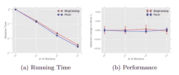 如图 2 所示,社交网络的随机游走中的顶点的频率分布和语言中的单词都遵循幂律。这尝试产生了不常见顶点的长尾,因此,影响Φ的更新本质上将是稀疏的。这允许我们在多任务情况下使用异步版本的随机梯度下降(ASGD)。鉴于我们的更新很稀疏,并且我们没有获得访问模型共享参数的锁,ASGD 将实现最佳的收敛速度 [36]。虽然我们使用多个线程在一台机器上运行实验,但据证明该技术具有高度可扩展性,可用于大规模机器学习 [8]。图 4 显示了并行化 DeepWalk 的效果。它显示了处理 BlogCatalog 和 Flickr 网络的速度是一致的,因为我们将工作器数量增加到 8(图 4a)。它还表明,相对于串行运行的 DeepWalk,预测表现不会下降(图 4b)。