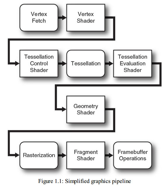Current GPUs consist of large numbers of small programmable processors called shader cores that run mini-programs called shaders(现在的这些显卡由很多可编程的处理器组成,这些处理器被称为着色核心,在处理器上运行的程序被称为着色器). Each core has a relatively low throughput(每个核心计算能力相对来说较低), processing a single instruction of the shader in one or more clock cycles and normally lacking advanced features such as out-of-order execution(比如在一个或者多个时间片内处理单一的一个来自shader的指令,并且通常来说是没有什么高级特性的), branch prediction,super-scalar issues, and so on. However, each GPU might contain anywhere from a few tens to a few thousands of these cores(但是显卡通常有几十个甚至上千个这样的计算能力不那么好的核心), and together they can perform an immense amount of work(这些家伙一起干活的时候,还是很牛的呢). The graphics system is broken into a number of stages(图形系统被分解成了很多个处理部分), each represented either by a shader or by a fixed-function(每一个部分要么被shader处理,要么被显卡中固定的硬件处理), possibly configurable processing block. Figure 1.1 shows a simplified schematic of the graphics pipeline(下面的图就展示了图形流水线的处理过程)