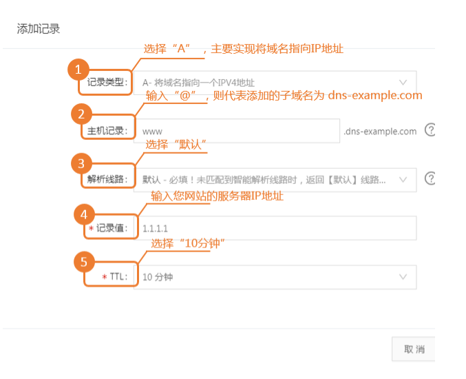 - 确保需要使用的“主机名.域名”没有被占用后,点击添加记录,填写如下: