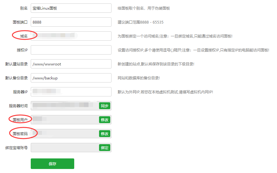 3.接着访问你的面板首地址,进入宝塔面板界面。点击面板设置,设置好你访问宝塔面板的 域名 ,修改好你的用户名和密码,点击保存。