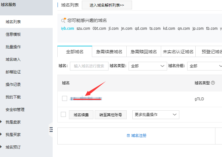 - 找到你需要解析的域名->点击这个域名后面的“解析“链接