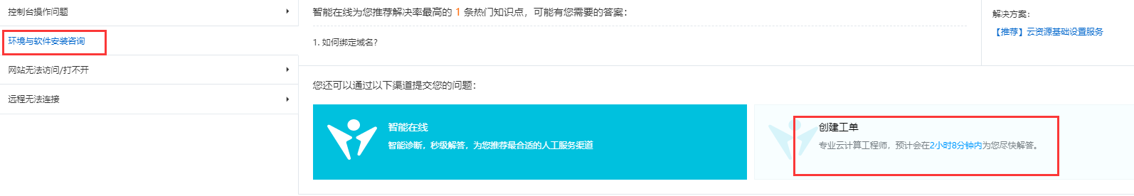 - 选择问题类型:环境与软件安装咨询-->创建工单