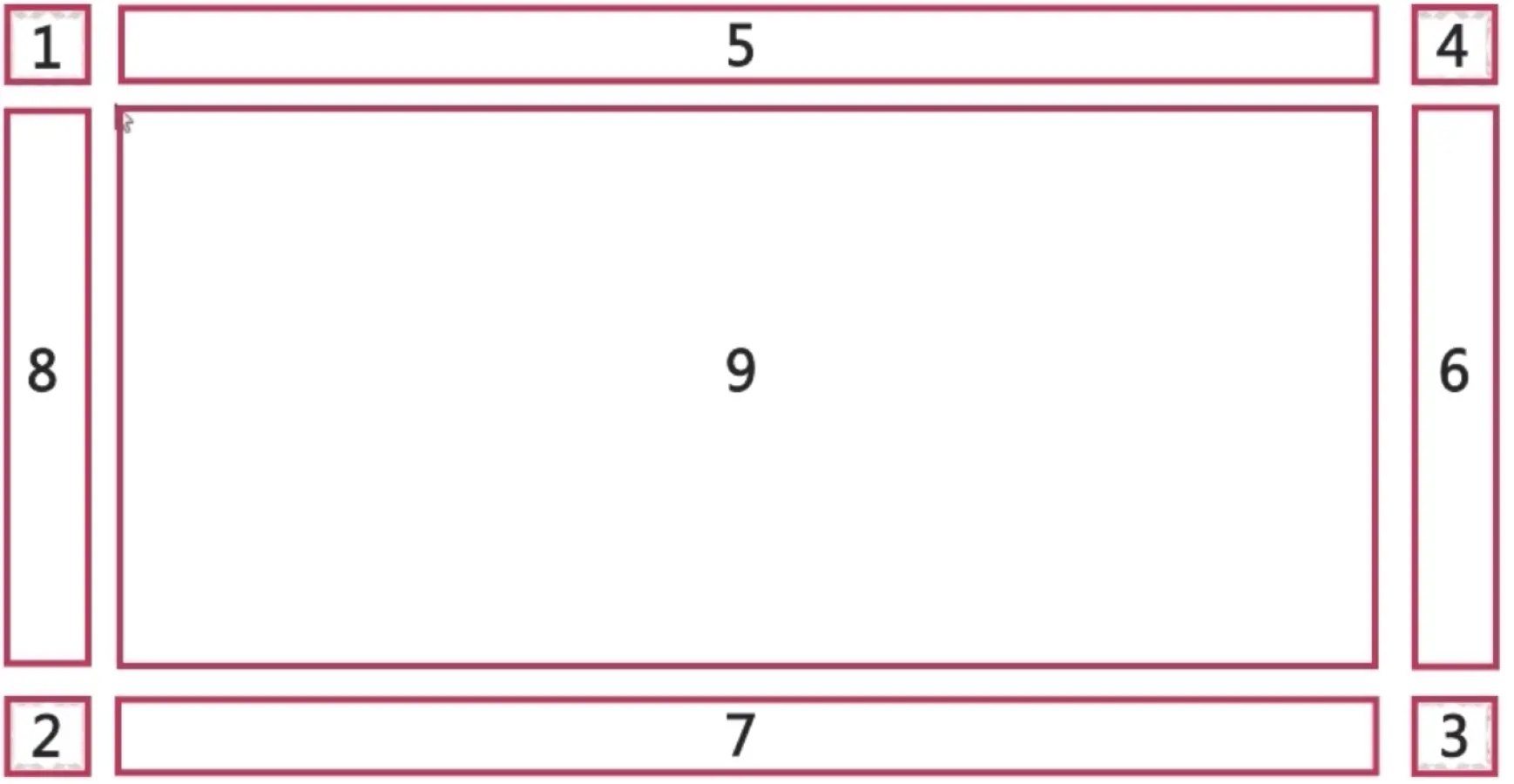 2、 border-image-slice:指边框图像顶部、左侧、顶部、右侧的内偏移量; 属性值: (1)number: 数字值,代表图像中像素(如果是光栅图像)或矢量坐标(如 果是矢量图像)。 (2)% : 相对于图像尺寸的百分比值:图像的宽度影响水平偏移,高度影响 垂直偏移。 (3)fill : 为可选属性值,假如指定,那么中间第九块不是透明块,假如不指定,那么为透明图片处理作用:如下图;把边框图像切成 9 个区域:4 个角、4 边区域和一个中间部位,可称作9宫格,假如说不应用fill这个可选属性值的话,那么中间第九块格子被当做透明不见;