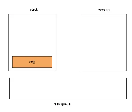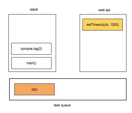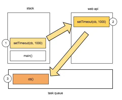 setTimeout(cb, 1000)进栈,发现setTimeout是浏览器api,因此把这段代码交由浏览器执行,1000ms后cb函数进入任务队列。