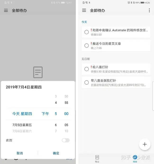 备忘录中的待办拥有完全独立于笔记的分类、提醒、位置标签和简化的优先级系统,俨然一个简化版 GTD 工具。这里 EMUI 又加入了一个非常贴合本地用户使用习惯的小细节—— 备忘录中的待办,提醒日期设置是支持农历日期的。