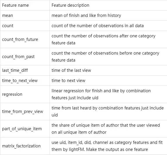 局部特征的构造,是根据时间顺序,划分出一部分作为历史数据,另一部分作为训练数据(即现在和未来),通过历史数据构造特征组合(只针对category),并统计训练数据需要的信息,如图1所示,按照时间的远近,靠近测试数据的30%数据作为训练数据,前面70%数据作为历史数据,可以去除最后5%的数据之后多次划分,训练多模型来提升效果。根据马尔可夫理论,当前的状态一般只和前面一个状态相关,这也是为何如此划分数据集的依据。提取的特征描述如表格1所示。