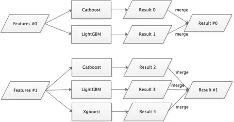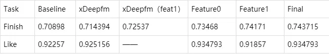 特征构造完成后,后续的任务就可以交给强大的机器学习算法来进行训练。常用的算法有基于boost算法的决策树和dnn算法(比赛中我们仅使用了前面的算法,是因为dnn的算法在增加全局特征后有提升的,但是和其他模型的结果进行融合后并没有提升,而且也没有boost的效果好)。如图2所示,针对不同特征使用不同的训练器训练流程,feature0代表局部特征,feature1代表全局特征,最后将两个框架的结果进行融合。每个阶段的比赛成绩如表2所示,只列出来赛道二中的部分成绩,“——”代表没有进行该项实验,由于全局特征在like任务的表现一直不理想,所以基于该特征的xdeepfm并未进行实验。中间关于参数选择和特征选择的成绩未列出。Final是最终提交的public成绩。