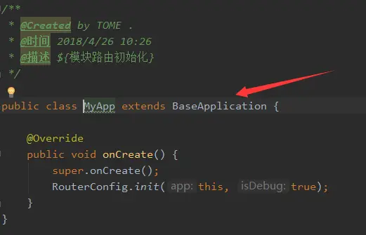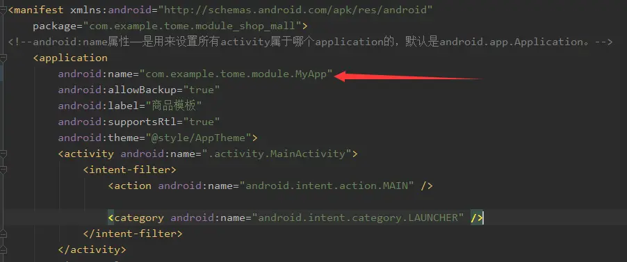 android:name属性——是用来设置所有activity属于哪个application的,默认是android.app.Application,那么当我们是组件化项目我们就指定我们创建的module下的MyApp,该MyApp继承于基类的BaseApplication.