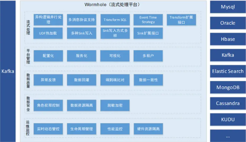 Wormhole支持的功能很多,如图1所示,除了流式数据处理,Wormhole在管理和运维等方面也做的比较完善。下面我们从流式处理、平台管理、数据质量、数据安全以及运维监控五个维度来介绍Wormhole的具体功能。