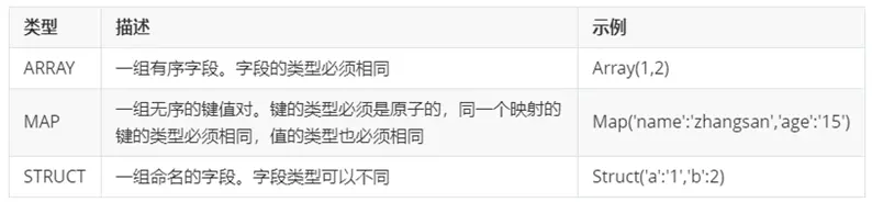 Hive支持关系数据库中大多数据基本数据类型,同时还支持三种复杂类型。