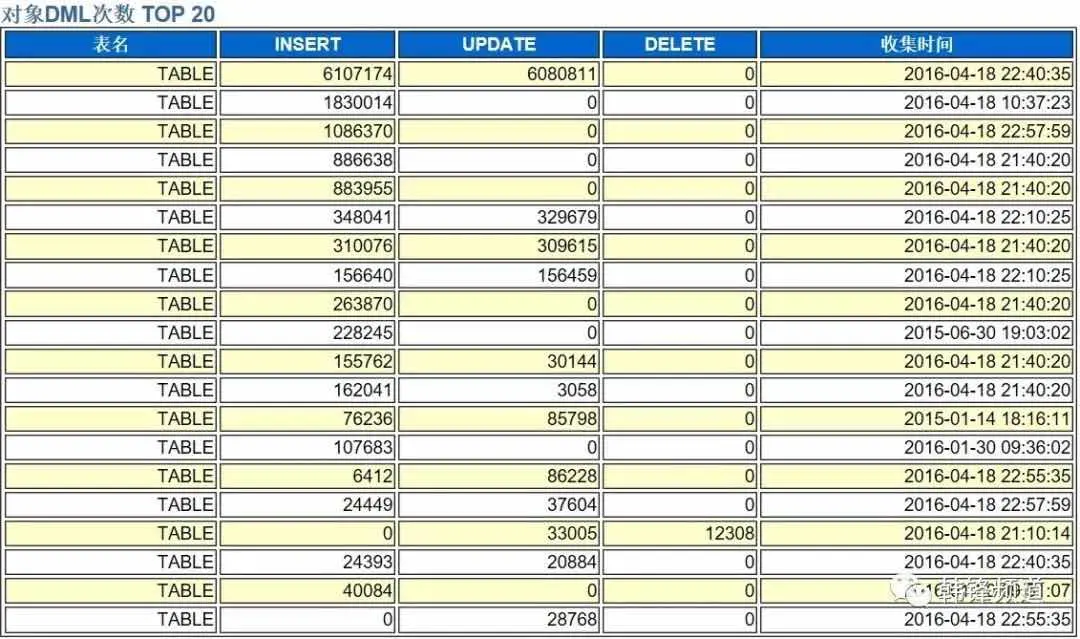 这里收集了,在过去的24小时内数据库中DML次数最多的Top20。这直接地反应出当前系统的操作的“热点”对象。这些对象都需要在选型之后、迁移之前重点评估其性能表现。能考虑分拆、缓存等手段,均可减低这些对象的热点压力。不仅局限于这些对象,更建议的是建立“业务压力模型”。通过对业务充分的了解和评估后,将业务逻辑抽象出来,转化为数据压力模型。此处的难点在于对业务逻辑的抽象能力及对模块业务量的比例评估。