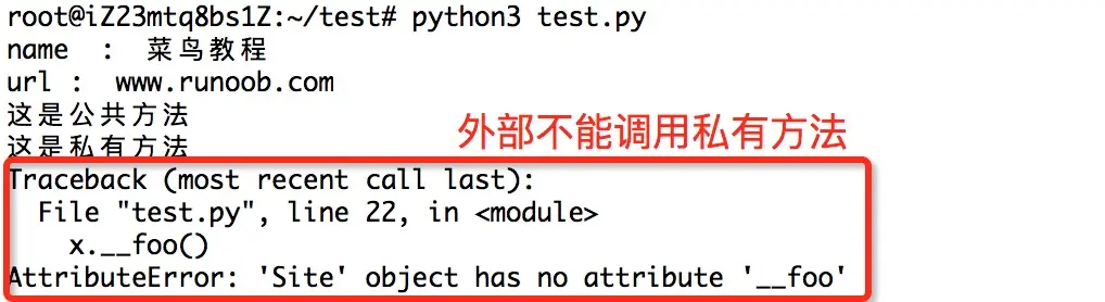 __private_method:两个下划线开头,声明该方法为私有方法,只能在类的内部调用 ,不能在类的外部调用。self.__private_methods。 类的私有方法实例如下: