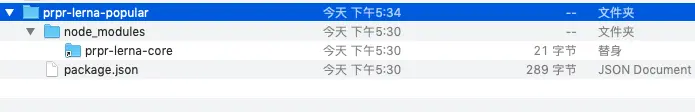 运行之后,我们发现prpr-lerna-popular生成了node_modules,而node_modules里生成了指向prpr-lerna-core的软链,类似npm link的效果: