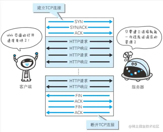 为啥需要复用:HTTP性能优化的关键并不在于高带宽,而是低延迟。TCP连接会随着时间进行自我「调谐」,起初会限制连接的最大速度,如果数据成功传输,会随着时间的推移提高传输的速度。这种调谐则被称为TCP慢启动。由于这种原因,让原本就具有突发性和短时性的 HTTP 连接变的十分低效。