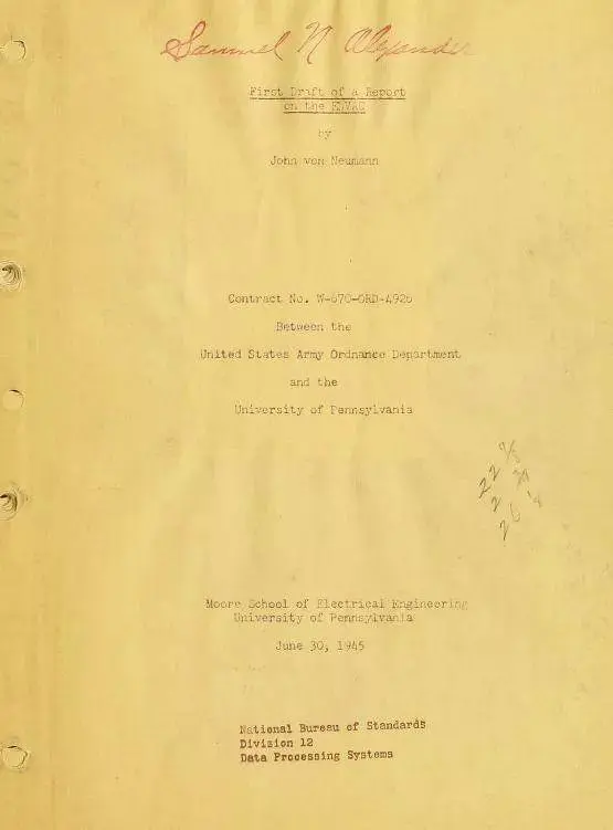 约翰·冯·诺依曼(John von Neumann)整理了新EDVAC机器的设计、会议记录和架构,并决定将它们写进一份报告中。受到战争努力的迫切性的激励,并希望撰写一份报告,详细说明他认为未来类似的机器如何设计用于帮助战争。他亲手写了这份报告,并把这些笔记寄回费城,在那里,他的同事赫尔曼·戈德斯廷(Herman Goldstine)把它们打印了出来。