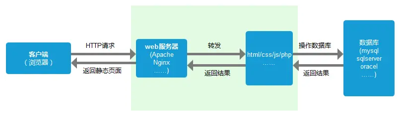 web服务器(准确说应该是http服务器)处理请求,诸如Apache、Ngnix、IIS等。web服务器解析用户请求,知道了需要调度哪些资源文件(HTML,css,js),再通过相应的这些资源文件处理用户请求和参数,并调用数据库信息,最后将结果通过web服务器返回给浏览器客户端。