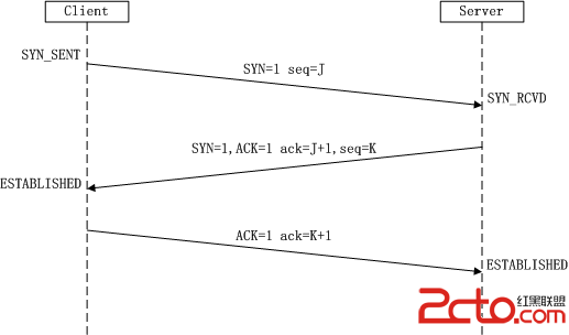 第二次握手:服务端B收到数据包后由标志位SYN=1知道客户端A请求建立连接,服务端B将标志位SYN和ACK都置为1,ack=J+1,随机产生一个值seq=K,并将该数据包发送给客户端A以确认连接请求,服务端B进入SYN_RCVD状态。