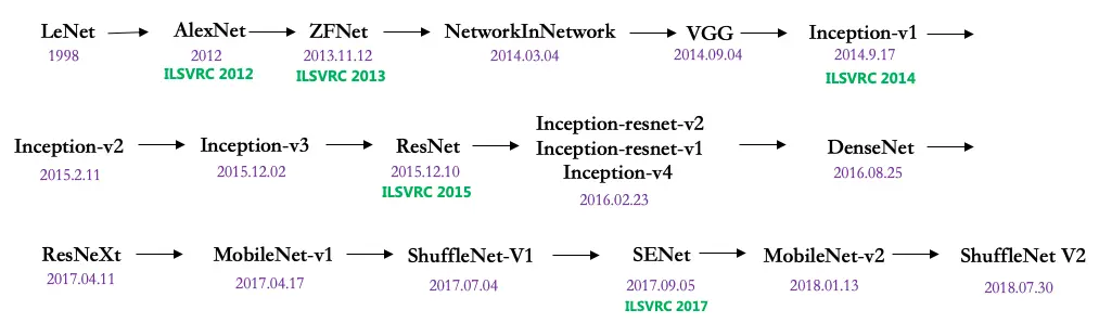 图像分类任务是计算机视觉的基础任务,大量的图像分类经典算法,大幅度推动了计算机视觉的发展。下图是各个经典算法的时间轴,图中都给出了各个经典模型的提出时间点。